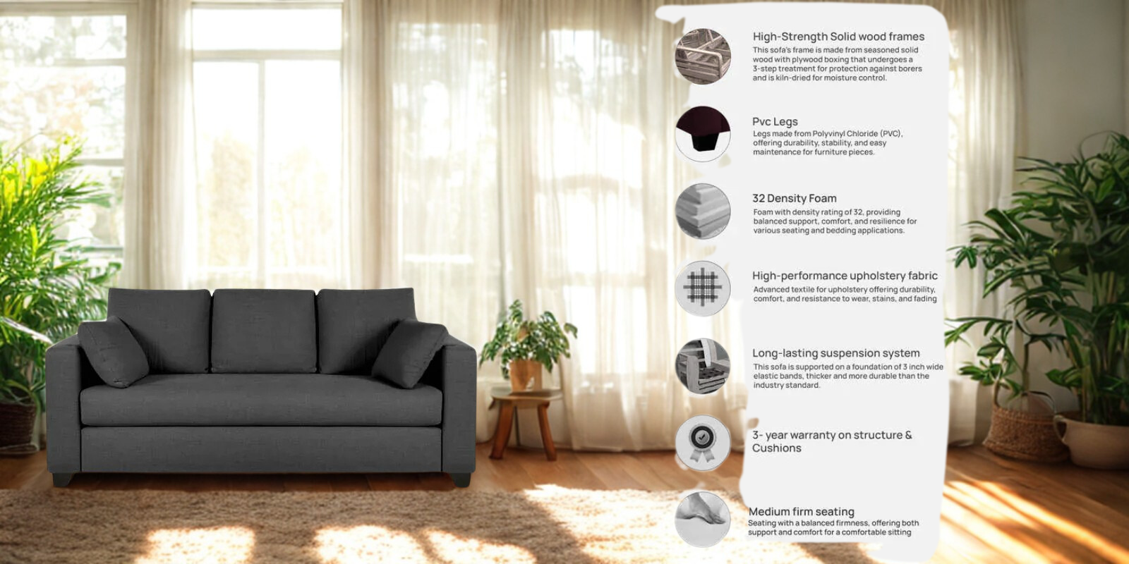 The dark grey color brings a sophisticated and timeless appeal that matches nearly every wall shade and décor style. Its soft yet supportive cushions create the ideal balance of coziness and structure, ensuring long hours of relaxation. The solid wood frame adds stability and long life, while the high-density seating ensures the sofa stays comfortable and retains its shape for years.